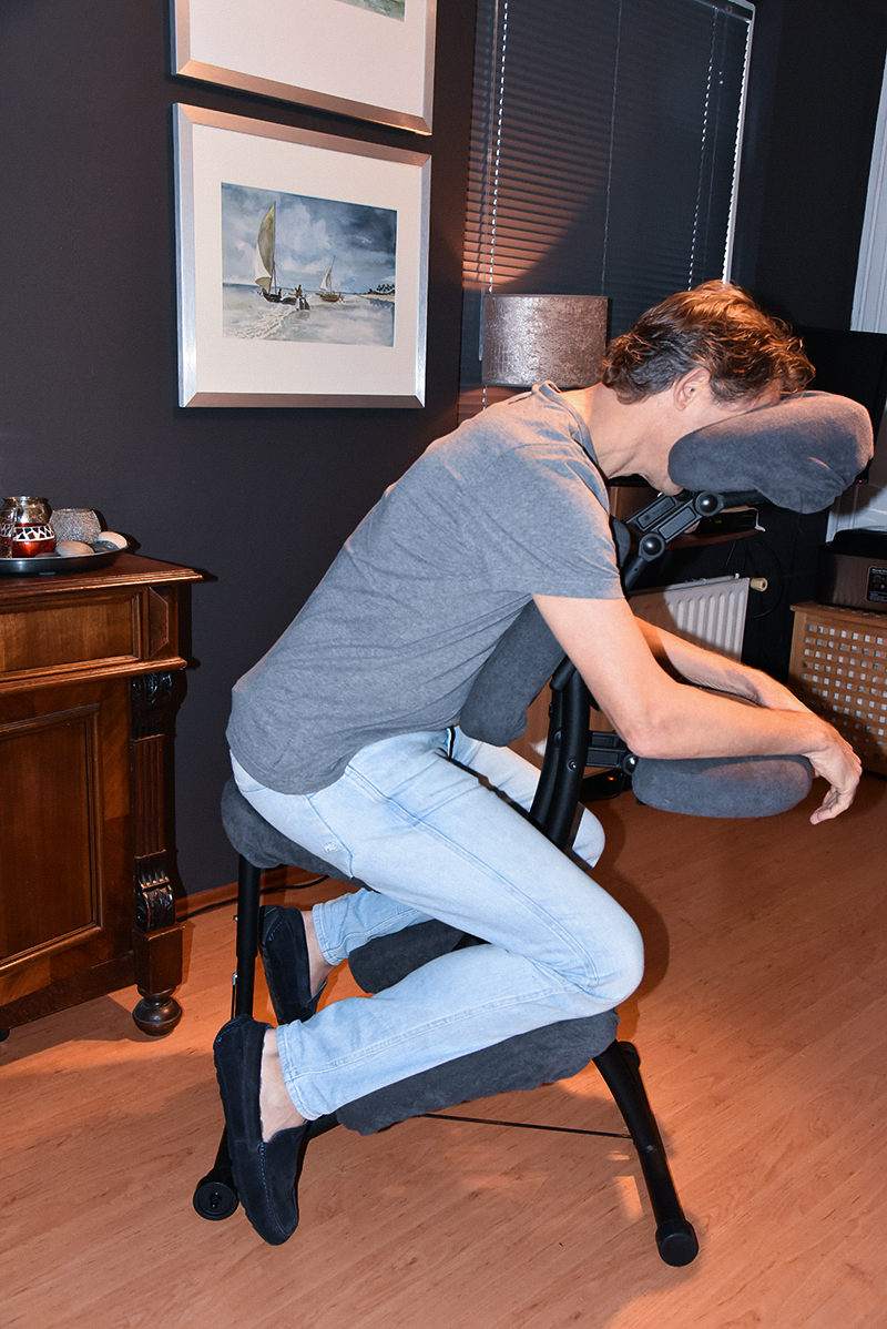 Tijdens de stoelmassage worden het hoofd, nek, schouders en gehele rug gemasseerd.